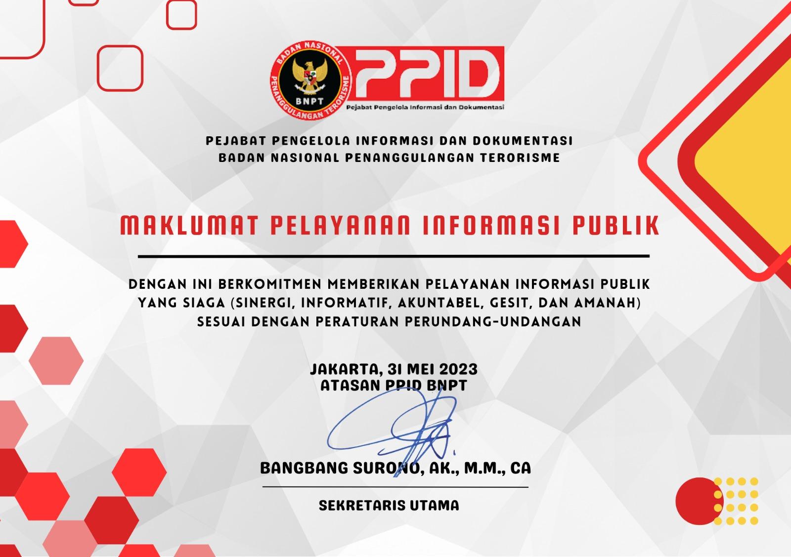 Layanan informasi publik PPID BNPT tersedia pada hari dan jam kerja sesuai ketentuan yang berlaku di lingkungan instansi pemerintah.